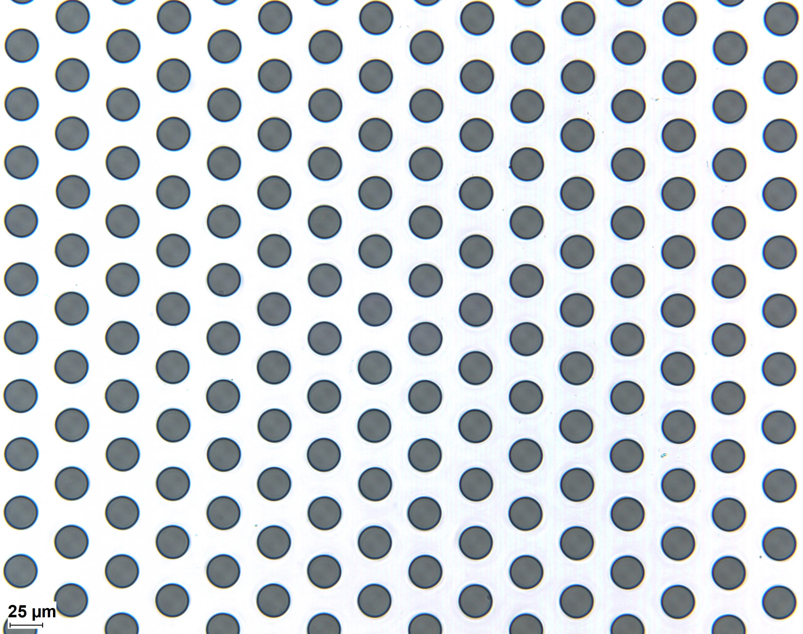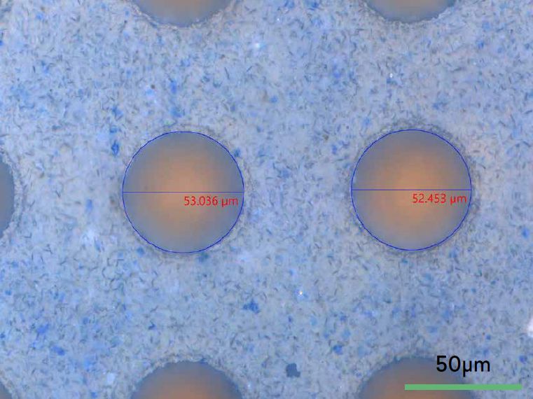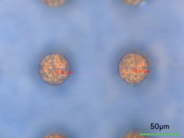 在多层三明治状基板上钻盲孔 - 25 μm 厚的介电层(蓝色)钻至金层(黄色)