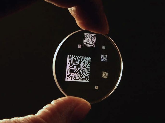 激光打标。通过使折射率不规则而直接写入物体(玻璃)内部,而不损坏表面
